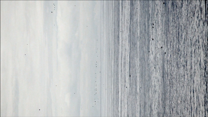 Il video è il ritratto di un gruppo di uccelli migratori girato nel punto più occidentale dell’Islanda, a Látrabjarg, nei Fiordi Occidentali. L’immagine è proiettata verticalmente per defamiliarizzare il paesaggio, per capirlo di più come “spazio” e per vedere il volo degli uccelli come “codice”. Da immigrata lei stessa, l’artista è interessata alle questione sulle migrazioni, sia degli animali che degli esseri umani. Tutti ci spostiamo dozzine di volte nel corso della nostra vita, disegnando rotte migratorie non diverse da quelle degli uccelli.