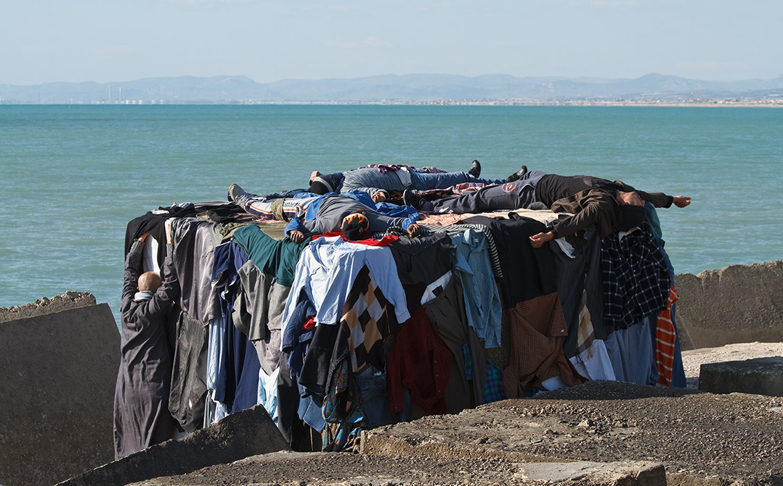 Riattualizzando il gesto di Maria Occhipinti, Loredana Longo farà sdraiare 6 giovani extracomunitari davanti alle ruote di un camion di prodotti agricoli mentre dal balcone della Torre Littoria sventolerà una bandiera di stracci colorati e verrà riproposta la frase “…….. ….. Tu primo a sorgere nella generosa terra di Sicilia”.