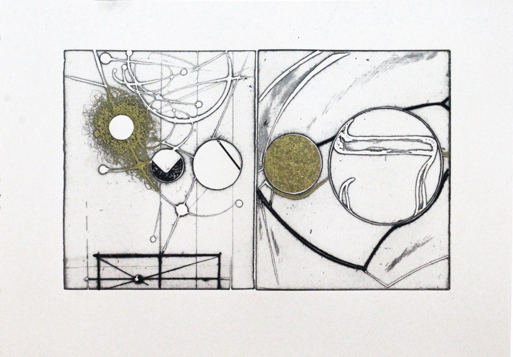 L’acquaforte Unitis Signis, nata dalla collaborazione dei due artisti che hanno incrociato e fuso le proprie poetiche, si compone di due riquadri affiancati, come le pagine aperte di un libro. La lastra di sinistra è quella incisa da Walter Valentini e presenta il consueto tema della misurazione delle costellazioni celesti, delle galassie che, con le loro orbite, circuitano attorno ai pianeti, creando un rapporto musicale e poetico tra linee e segni. Il lavoro è unificato dal motivo delle cinque sfere a cui Valentini ha configurato sul piano e Gaggia ha permeato di un suo contenuto. Le cinque sfere hanno un significato preciso e alludono alle fasi di metamorfosi della farfalla (elemento ricorrente nell’opera del giovane artista). Lo sfondo della lastra di destra, inchiostrato come quello di sinistra e completato dal segno di Gaggia, è attraversato dalle linee curve, sinuose e delicate delle ali di una farfalla per rafforzare ancora di più il senso di rinascita a nuova vita, come auspicio al raggiungimento di bellezza, perfezione ed equilibrio interiore.