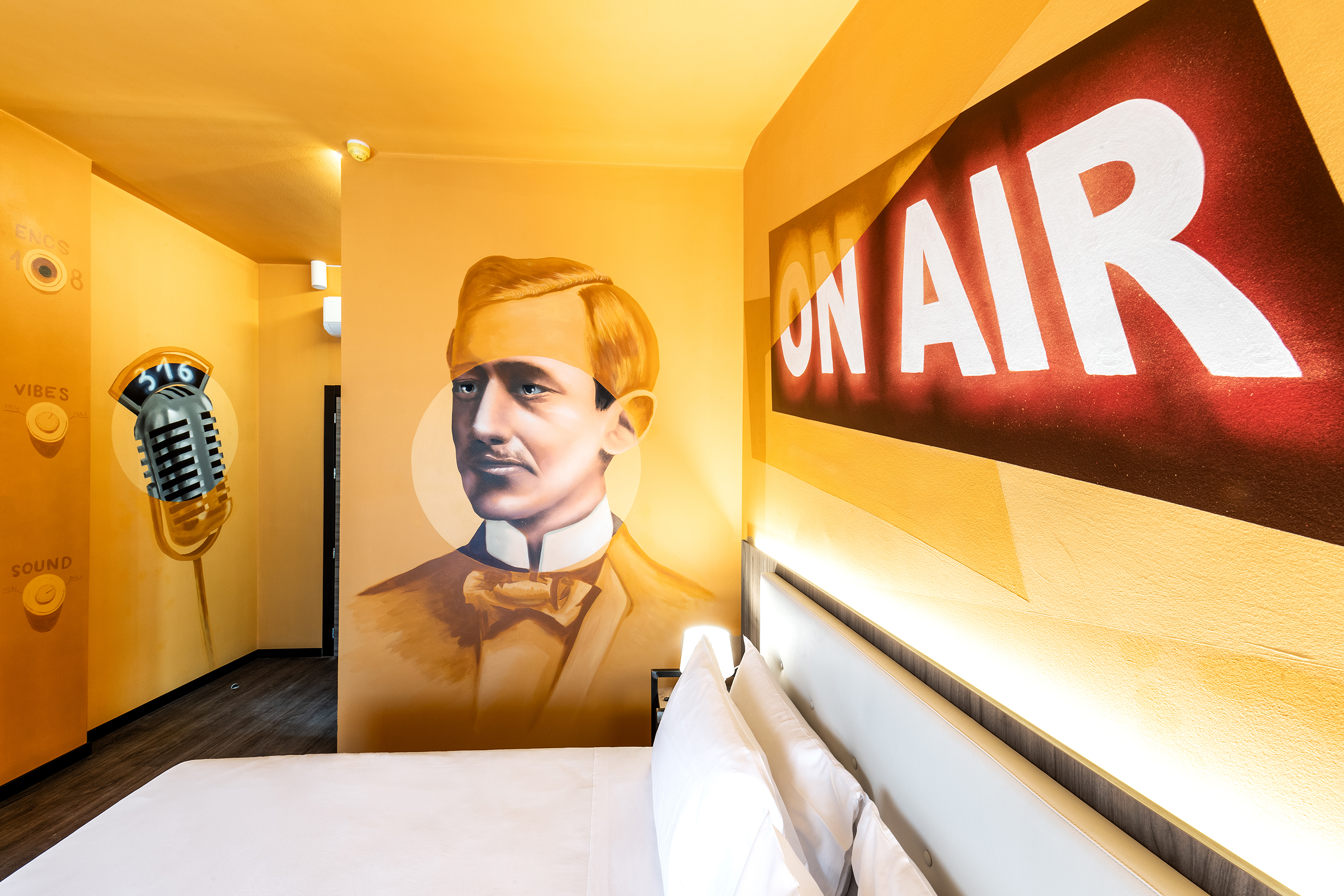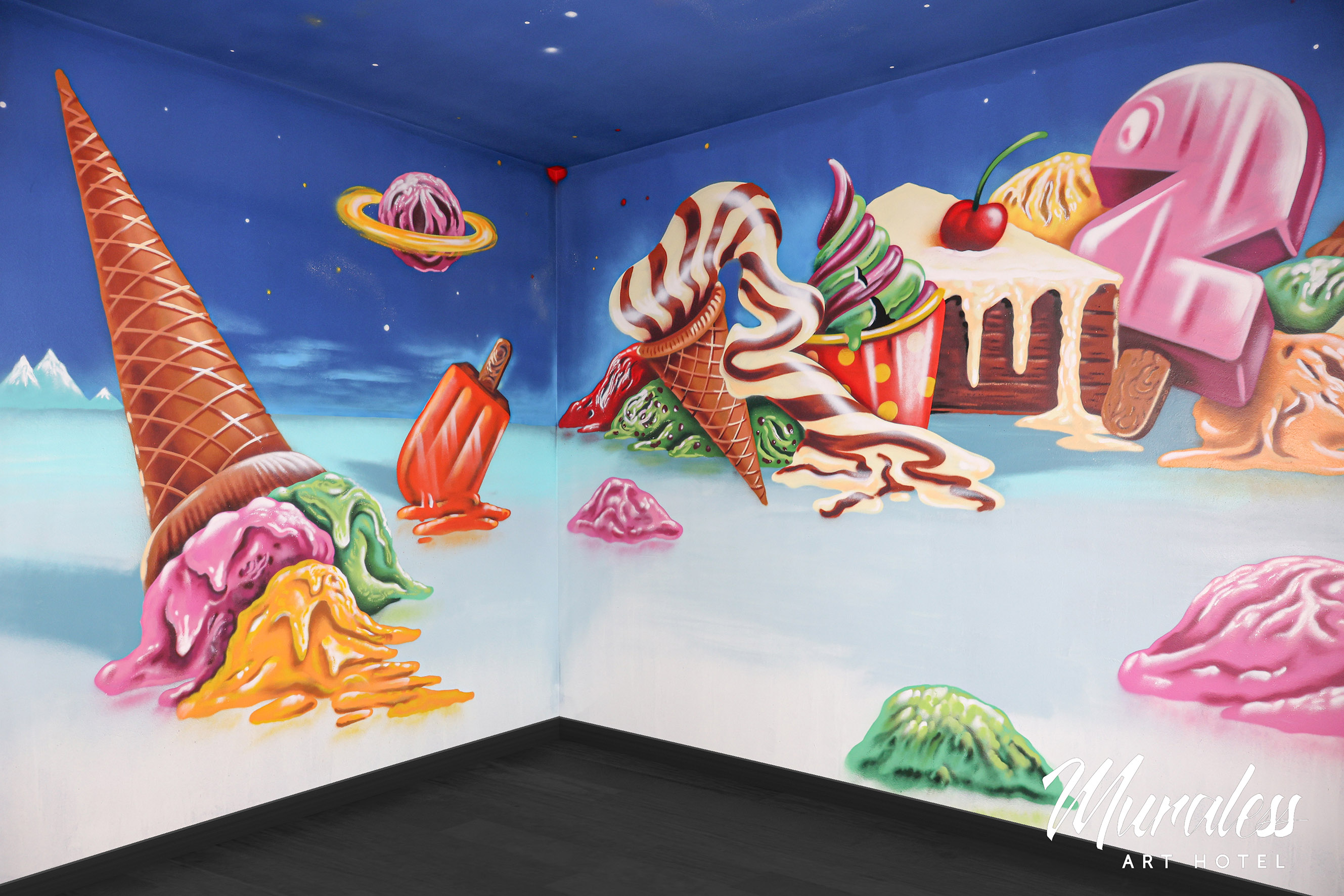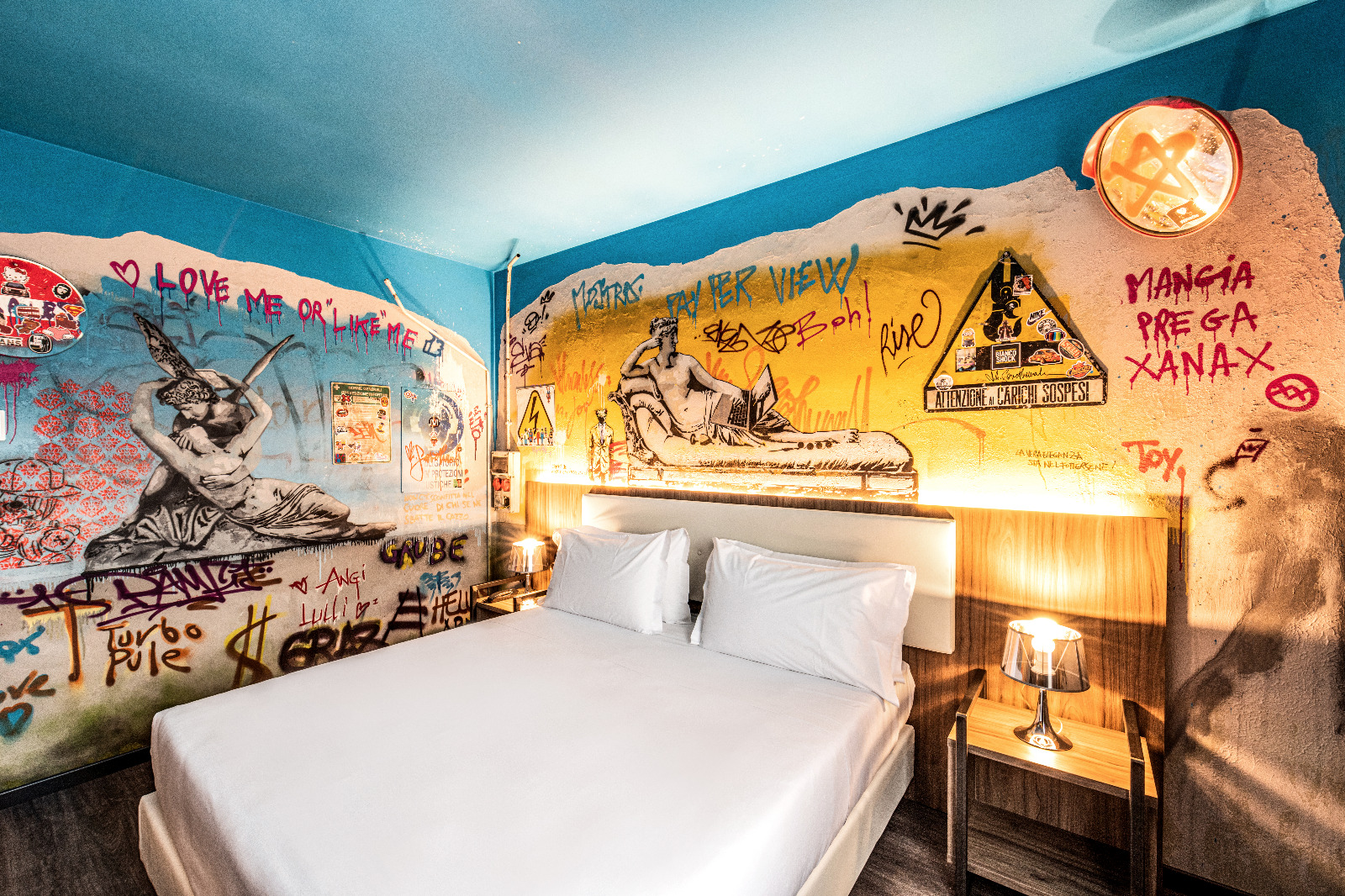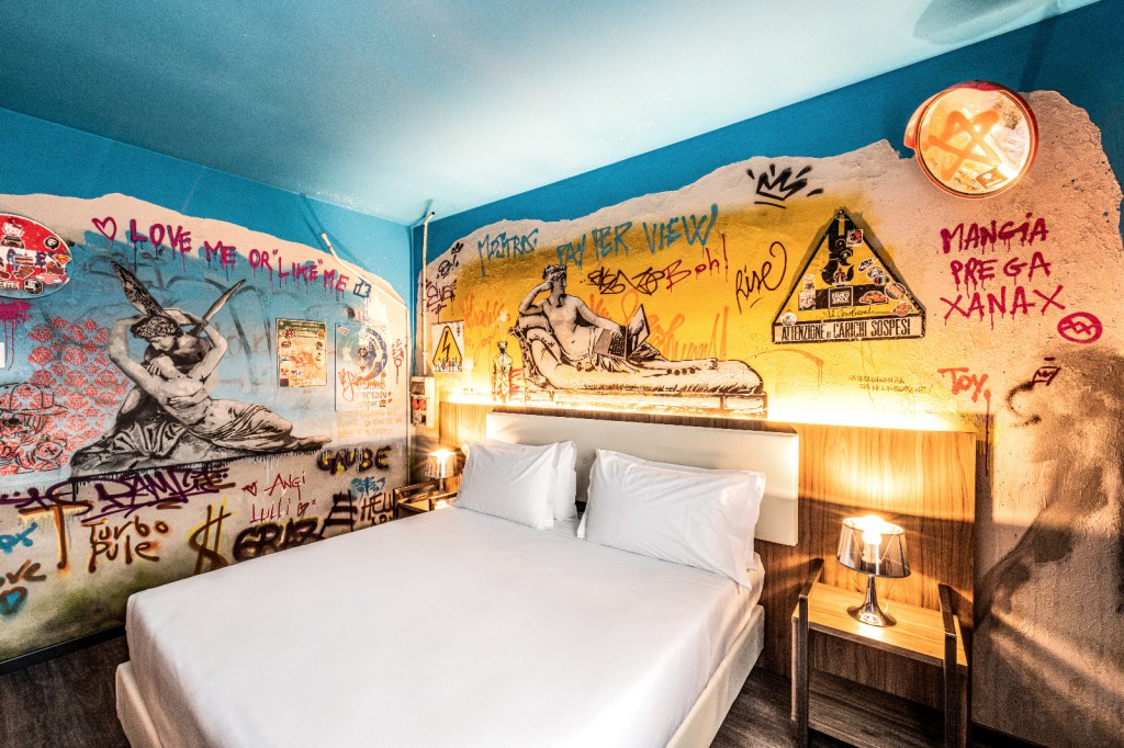 Muraless Art Hotel è il primo Hotel e unico al mondo interamente dedicato alla Street Art. Una struttura ricettiva ma non solo. Con le sue oltre novanta stanze, gli spazi comuni, la facciata esterna interamente dipinti, punta ad essere un vero e proprio tempio della Street Art, un Museo dedicato all’Arte Urbana e ai suoi protagonisti, una Galleria vivente. Il progetto è realizzato in collaborazione con la galleria Milanese Deodato Art, con la curatela di Chiara Canali, curatrice indipendente esperta nei linguaggi della Street Art e la collaborazione di Andrea Zamengo (Chill Surrealist). La facciata esterna di Muraless Art Hotel porta la firma di Mr Brainwash, uno degli street artist più quotati al mondo.