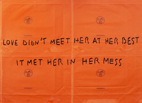 In mostra presso KROMYA Art Gallery, circa trenta opere tra soggetti nuovi e già conosciuti, come la nota scritta in acrilico sui sacchetti à pois Louis Vuitton: The Best Things Are Not Things (Le cose migliori non sono cose) oppure l’opera cult sulle shoppers arancio Hermès: Love didn’t meet her at her best / it met her in Her mèss (L’amore non l’ha incontrata al suo meglio / l’ha incontrata nel suo caos – in Hermès), nata nel 2019 da una foto scattata all’ingresso del cantiere del negozio in via Monte Napoleone a cui Terzini aggiunse la scritta con Photoshop.