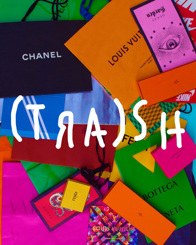 Il titolo della mostra, (TRA)SH, allude al medium espressivo utilizzato per realizzare lo sfondo delle opere, cioè i sacchetti, le scatole, i contenitori dei più grandi marchi internazionali di moda e design che, dopo essere diventati materiali di “scarto”, “trash”, “immondizia di lusso”, vengono riattivati e trasformati in “arte” (TRA=ART), cioè oggetto di valore, attraverso una operazione dadaista di recupero, decostruzione e ricostruzione.