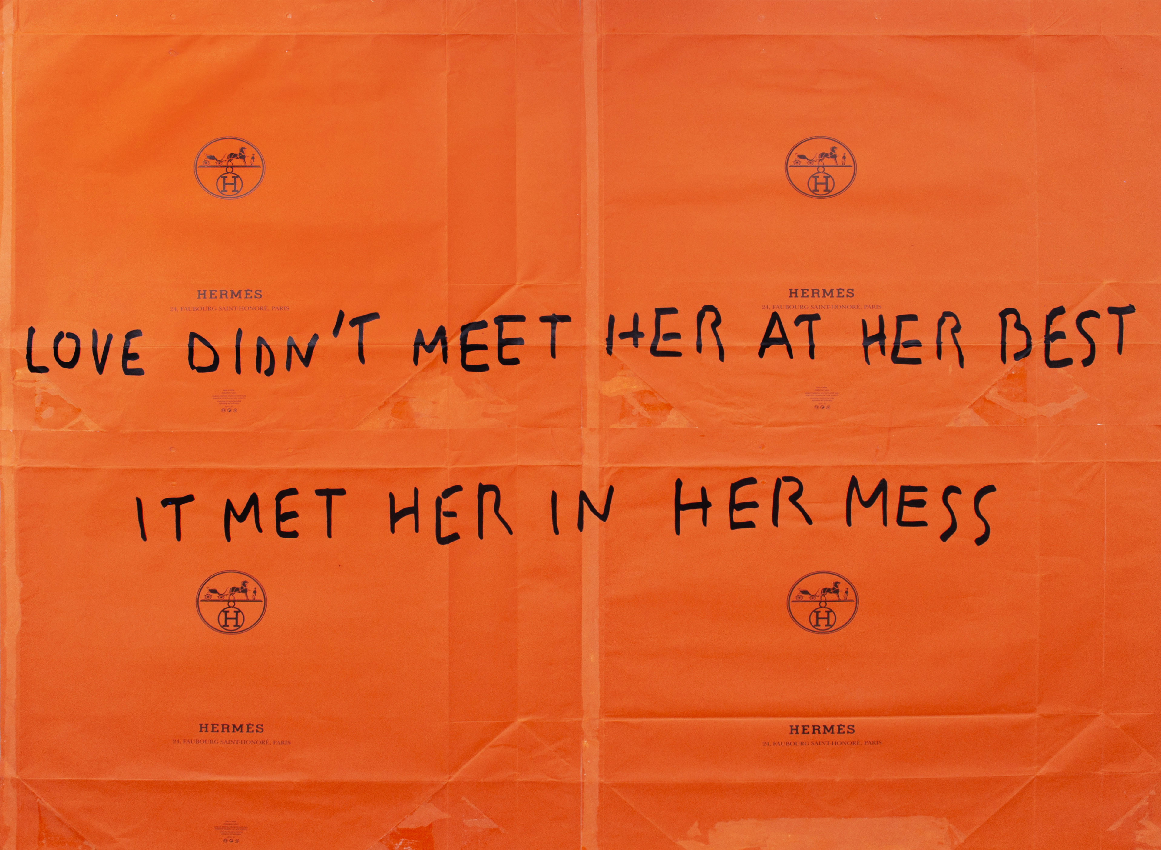 In mostra presso KROMYA Art Gallery, circa trenta opere tra soggetti nuovi e già conosciuti, come la nota scritta in acrilico sui sacchetti à pois Louis Vuitton: The Best Things Are Not Things (Le cose migliori non sono cose) oppure l’opera cult sulle shoppers arancio Hermès: Love didn’t meet her at her best / it met her in Her mèss (L’amore non l’ha incontrata al suo meglio / l’ha incontrata nel suo caos – in Hermès), nata nel 2019 da una foto scattata all’ingresso del cantiere del negozio in via Monte Napoleone a cui Terzini aggiunse la scritta con Photoshop.