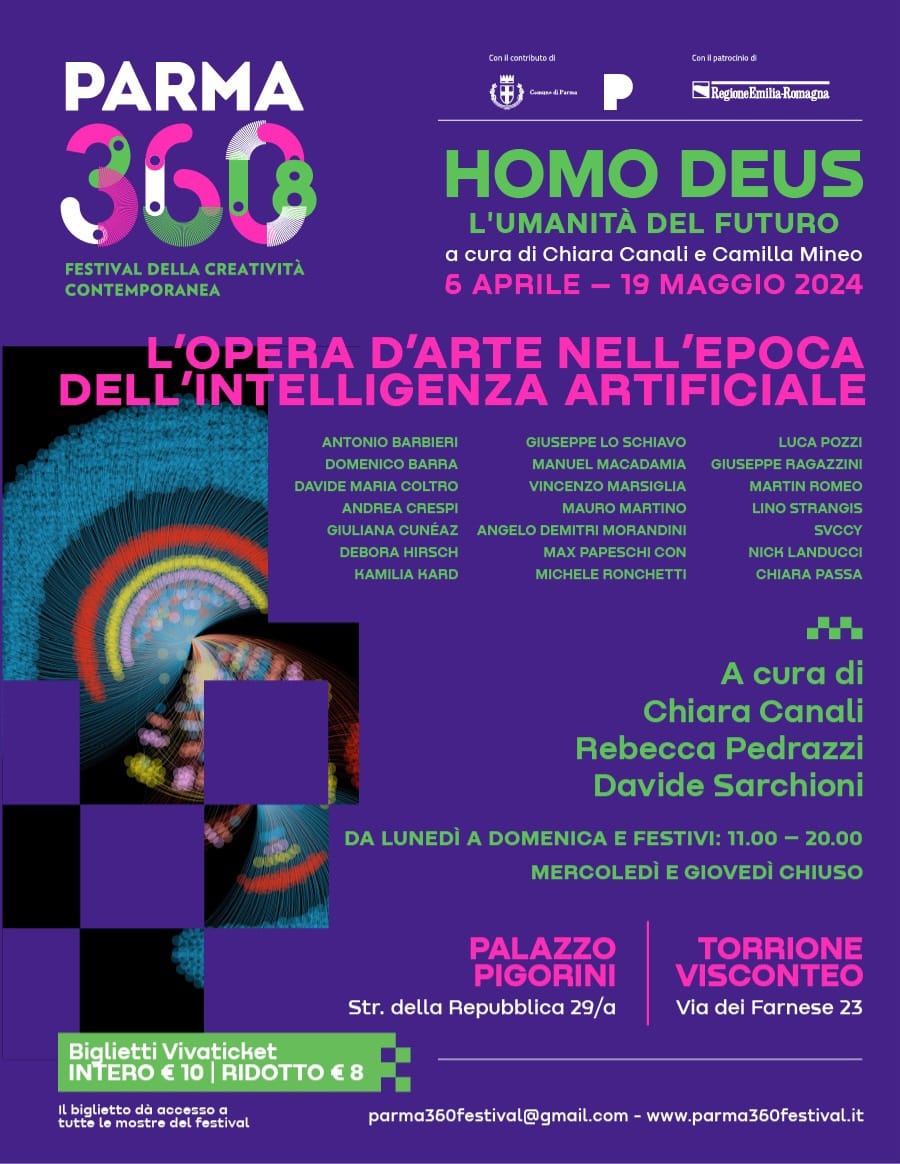 In occasione della ottava edizione di PARMA 360 Festival della creatività contemporanea, in programma dal 6 Aprile al 19 Maggio 2024, gli edifici storici di Palazzo Pigorini e del Torrione Visconteo ospitano la prima mostra collettiva di artisti italiani sulla Intelligenza Artificiale, a cura di Chiara Canali, Rebecca Pedrazzi e Davide Sarchioni.
