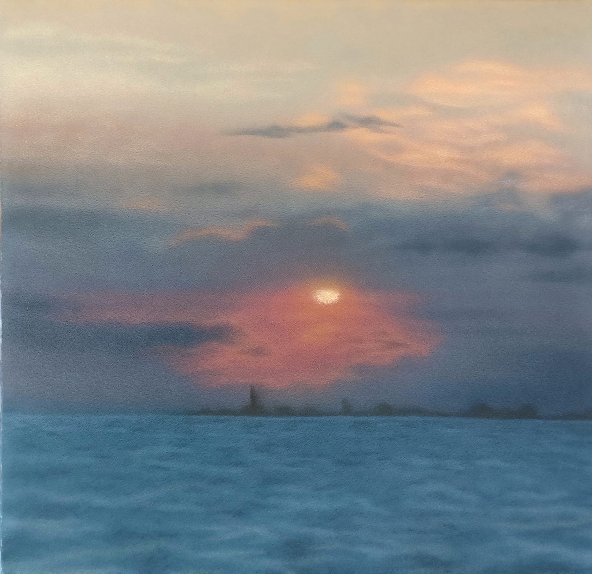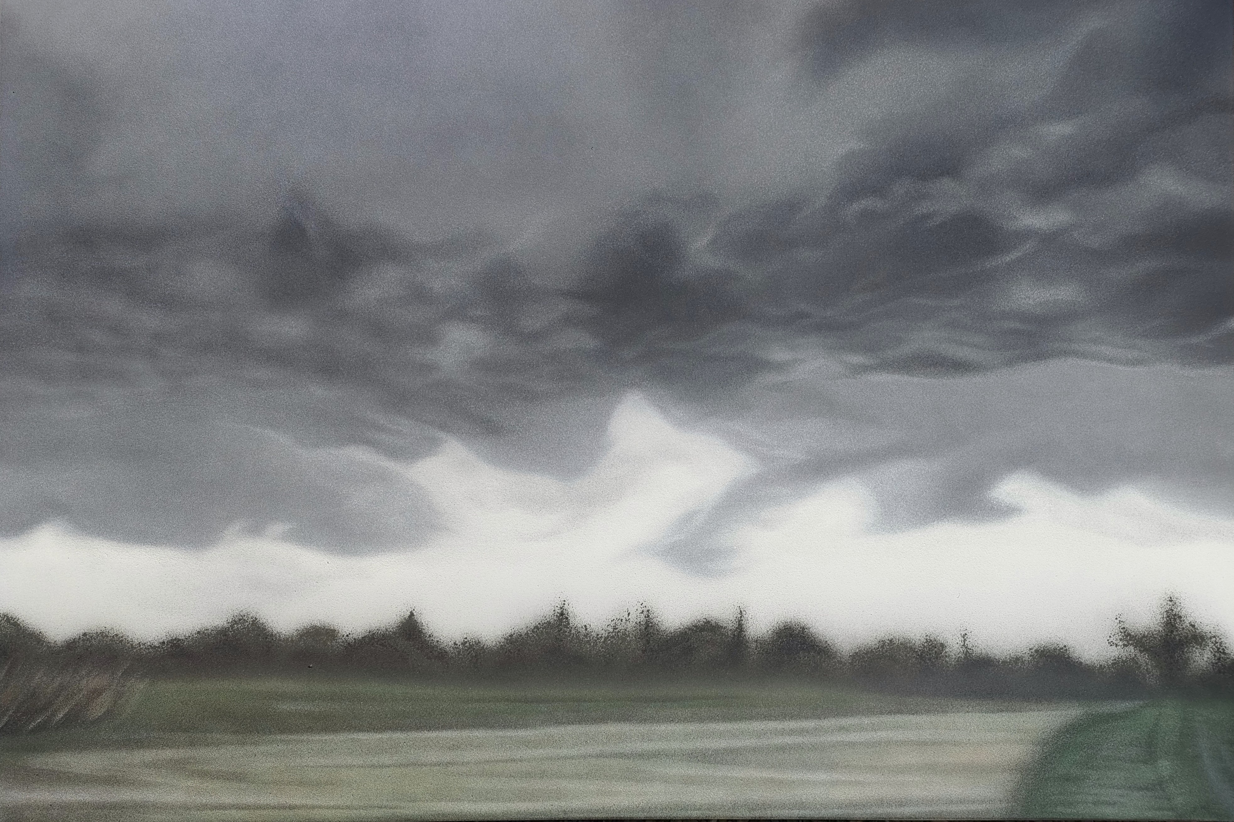 In mostra alla Galleria Zamagni di Rimini una trentina di opere, interamente realizzate a spray su tela, suddivise in cinque sezioni tematiche: le Nebbie, che combinano orizzonti bassi, prospettive centrali e alture a rilievo, in una sorta di teatralità dell’anima: la nebbia, così come la materia densa del colore a spray che la costruisce, si infiltra nei pertugi della terra e del cielo, in un’armonia morbida e crepuscolare. Le Tempeste, motivo declinato in turbinose atmosfere nelle quali è protagonista un magnifico cielo tormentato, solcato da nubi grigiastre che volgono al cinereo. I Cieli e Nuvole, dove il cromatismo unificato e attenuato del cielo, rotto dai ritagli impalpabili delle nubi che disegnano sagome fantasmagoriche sopra la terra, evoca un concetto di irrealtà. Le Albe e Tramonti, in cui l’ora squisita del tramonto non rappresenta più unicamente un momento di sensualità malinconica ma diventa qui l’istante sacro di una meditazione che unisce la natura e lo spirito e riesce a dare alla pittura stessa una forte densità emotiva.