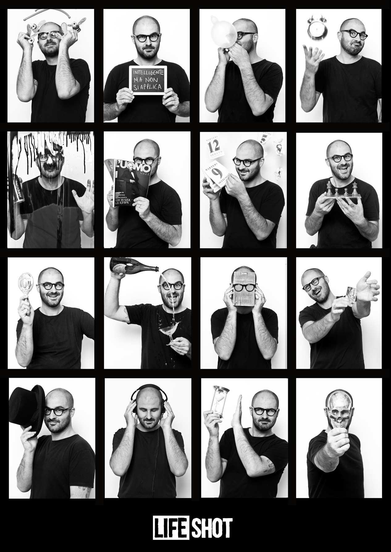 L’opera inedita “LIFESHOT” riporta, invece, l’attenzione sulla vita dell’uomo che, per l’artista, è “la più importante opera d’arte”. Si tratta di una rilettura di Mr. Savethewall sul tema del ritratto fotografico, una re-interpretazione del soggetto a partire dalla individuazione di 16 momenti miliari della vita di ciascun individuo. (Nascere, crescere, scoprire, imparare, amare, lavorare, invecchiare, morire. Soddisfazioni e insuccessi, passioni e vizi, gioie e paure). 16 scatti fotografici sintetizzati in 16 oggetti o feticci personali (la clessidra, la scacchiera, lo specchio, il teschio…) selezionati dall’artista e dal partecipante, in un viaggio senza tempo né spazio alla riscoperta del più profondo io esistenziale.