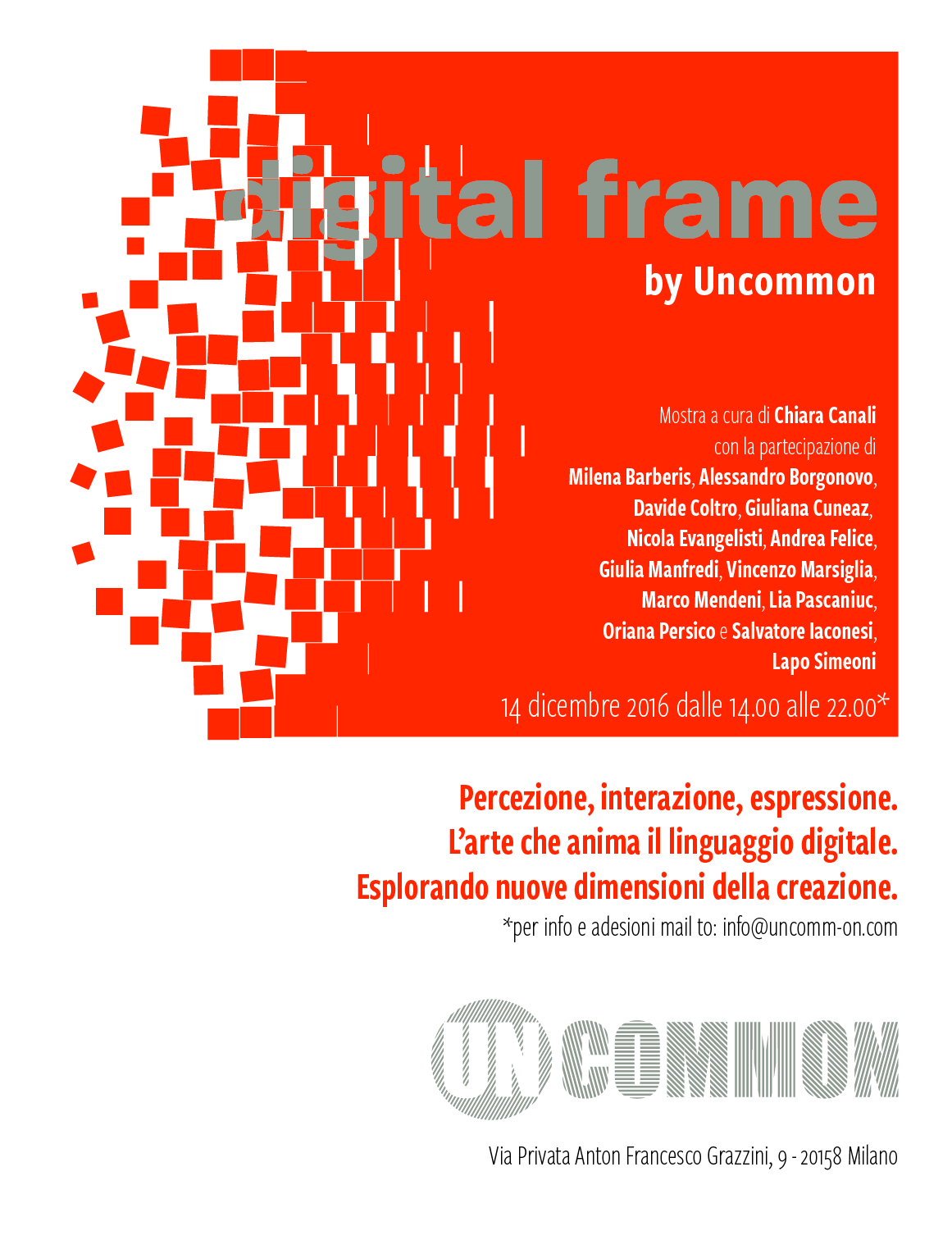 L’Agenzia di comunicazione Uncommon è lieta di ospitare nei suoi spazi la mostra Digital Frame, a cura di Chiara Canali, un percorso espositivo delle opere di artisti di fama internazionale, dove i linguaggi dell’arte e della tecnologia si uniscono per espandere reciprocamente le proprie potenzialità espressive.