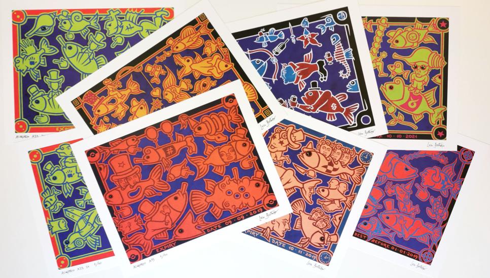 Pesci surreali con tratti molto umani, stracarichi di elementi e di particolari, in un horror vacui che riflette i meccanismi di accumulo e straniamento della nostra società, che ci suggeriscono profonde riflessioni sull’arte del vivere.