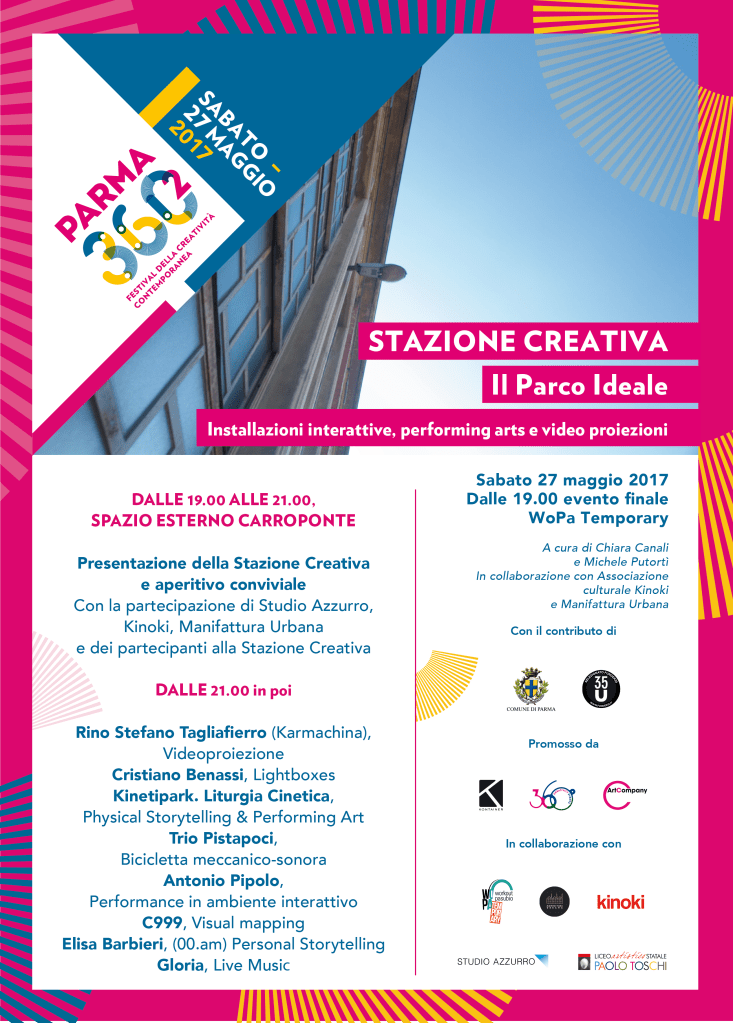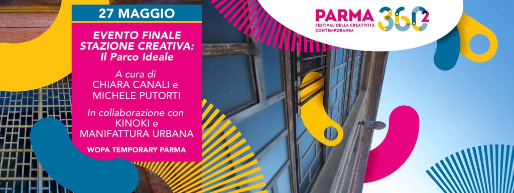 • STAZIONE CREATIVA Il Parco ideale PARMA, WoPa Temporary  Sabato 27 maggio 2017 Dalle 19.00, evento finale A cura di Chiara Canali e Michele Putortì In collaborazione con Associazione culturale Kinoki e Manifattura Urbana Nell’ambito di PARMA 360 Festival della creatività contemporanea, sabato 27 maggio, dalle 19.00 si svolgerà al WoPa Temporary di Parma l’evento finale…
